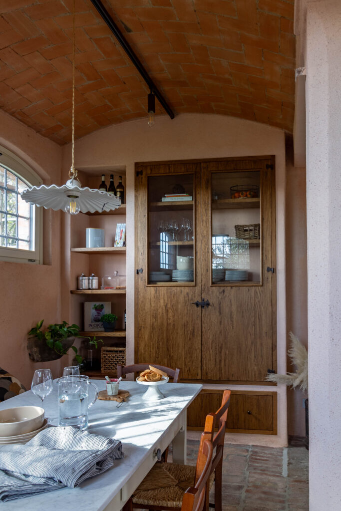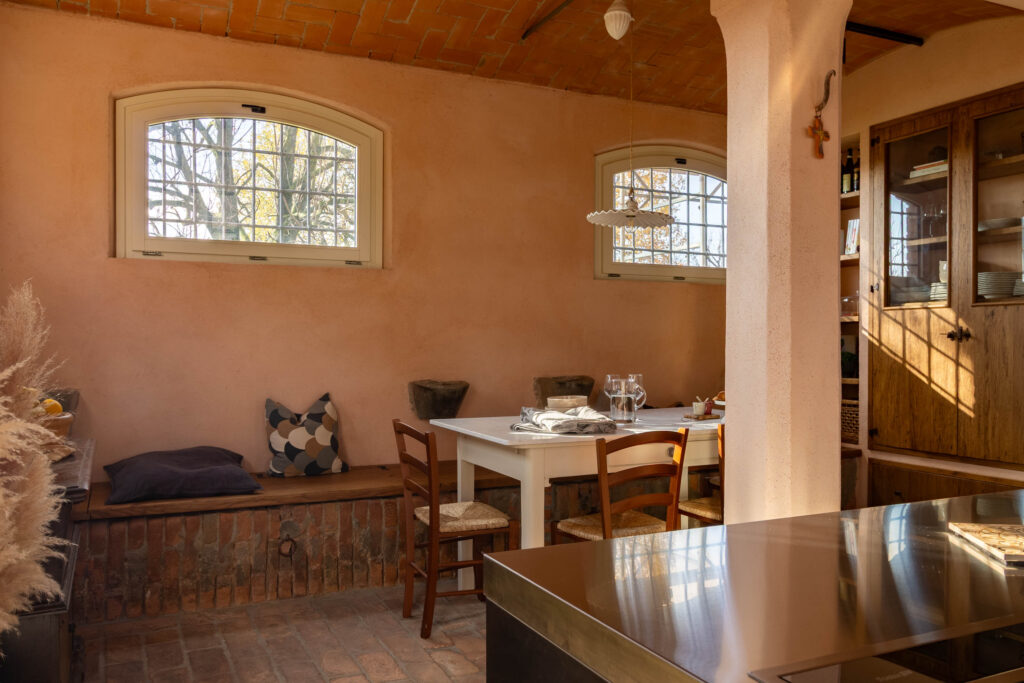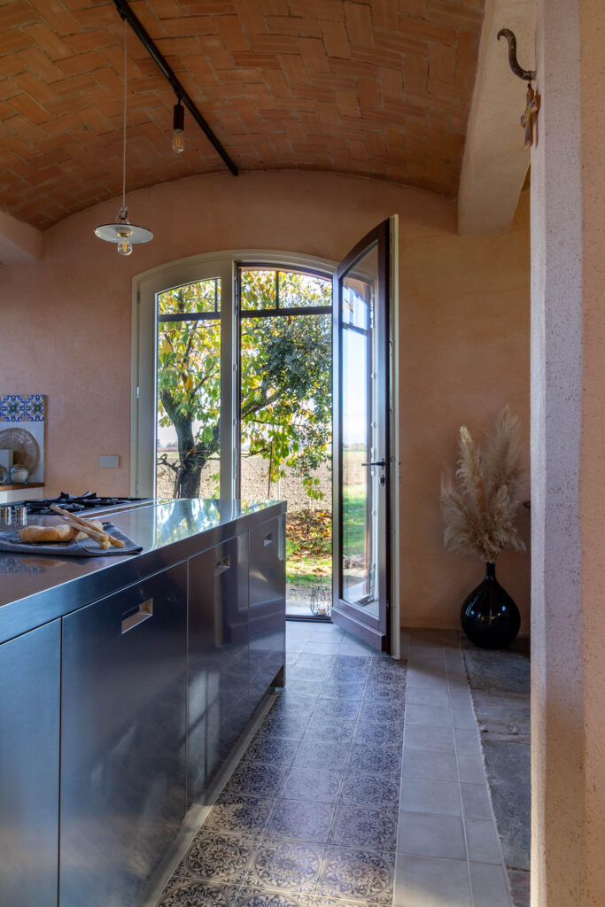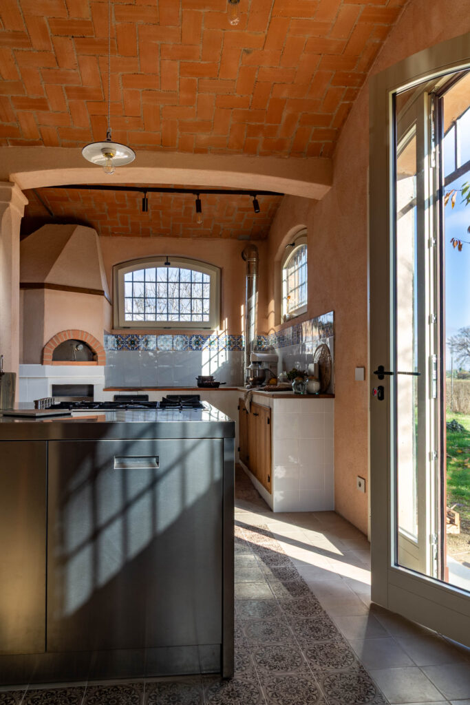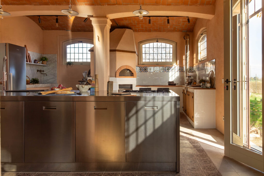 Il risultato: una cucina di 40 mq, dai colori caldi e accoglienti, con un mix di materiali e arredi che fondono la tradizione rurale e contadina (elementi in muratura, legno e marmo di Carrara disegnati su misura), alla contemporaneità e alla funzionalità (pavimentazione centrale in gres e grande isola in acciaio inox).
